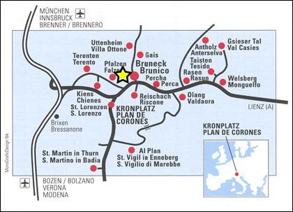 Über Verona bis Thalackerhof: Nehmen Sie die Autobahn A22 und folgen Sie der Beschilderung Bozen/Brenner. Ausfahrt Brixen, hier dann Abbiegen nach "Pustertal-Bruneck". Folgen Sie der Beschilderung Richtung Bruneck.